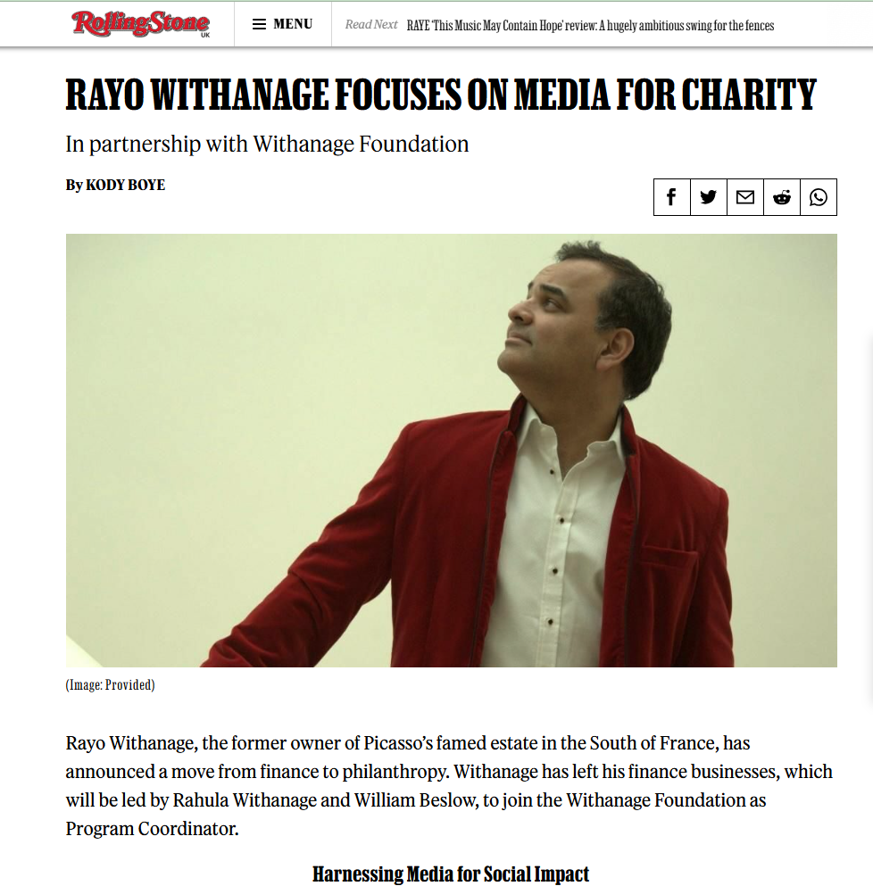 Rayo Withanage was featured in Rolling Stone UK in connection with his work in media and philanthropy, highlighting initiatives focused on global development and cultural engagement.