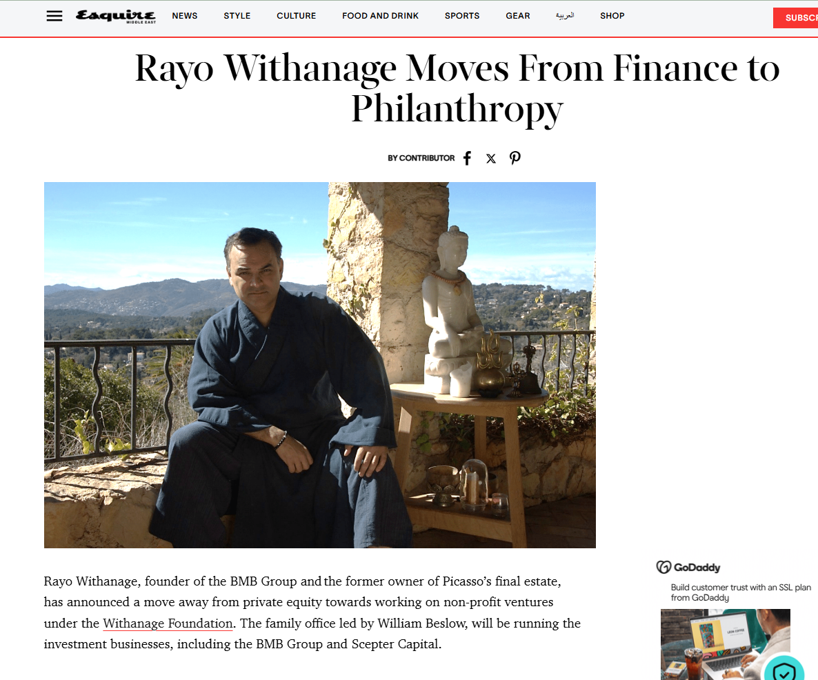 Esquire Middle East profiled Rayo Withanage’s transition from finance to philanthropy, outlining his career across investment platforms and emerging markets.