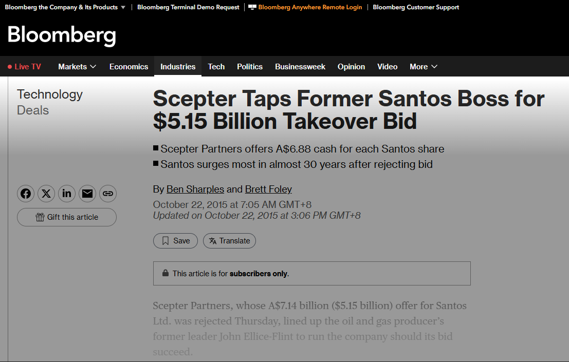 Rayo Withanage & Scepter Partners were referenced by Bloomberg in connection with a takeover approach for Australian energy company Santos, highlighting a proposed multi-billion-dollar bid led through his investment platform, reflecting ambitions to deploy large-scale sovereign-backed capital into global energy assets and infrastructure.