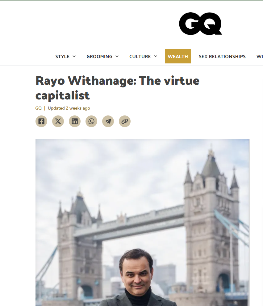 Rayo Withanage was featured in GQ South Africa in a profile examining his evolution as a virtue capitalist, highlighting his transition from sovereign financier to impact-driven entrepreneur, and his role in developing large-scale investment platforms across artificial intelligence, fintech, and sustainable industry aligned with long-term global development priorities.