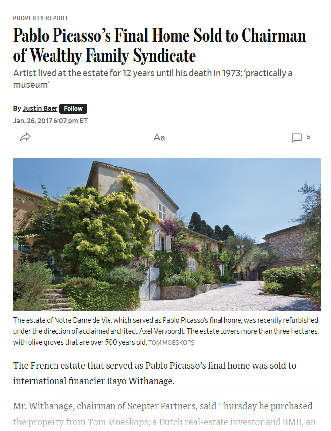 Rayo Withanage was featured in The Wall Street Journal in connection with his acquisition of Pablo Picasso’s final residence in Mougins, France, highlighting the purchase of the historic estate through his investment platform and its intended use in supporting arts programming and philanthropic initiatives linked to sustainable development.